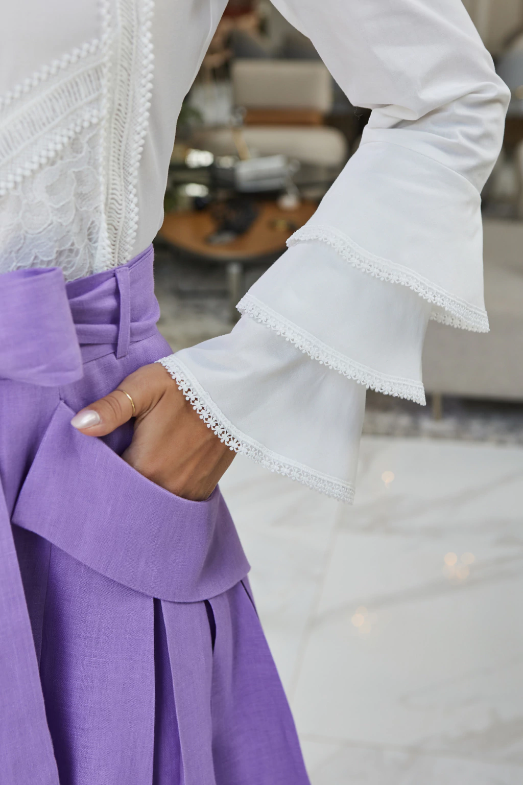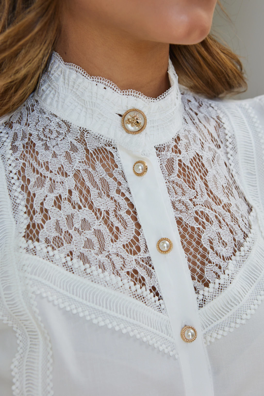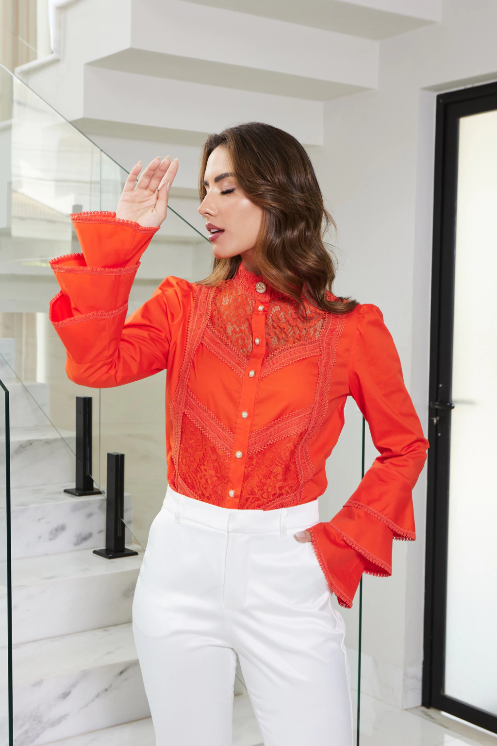 O destaque da camisa é o detalhe em renda na frente, que adiciona um toque de delicadeza e feminilidade ao visual. Os botões na frente garantem um fechamento seguro e adicionam um elemento de elegância clássica. Os punhos com três camadas e detalhes em renda adicionam um toque de sofisticação extra aos punhos, criando uma silhueta distinta e elegante que é verdadeiramente encantadora.