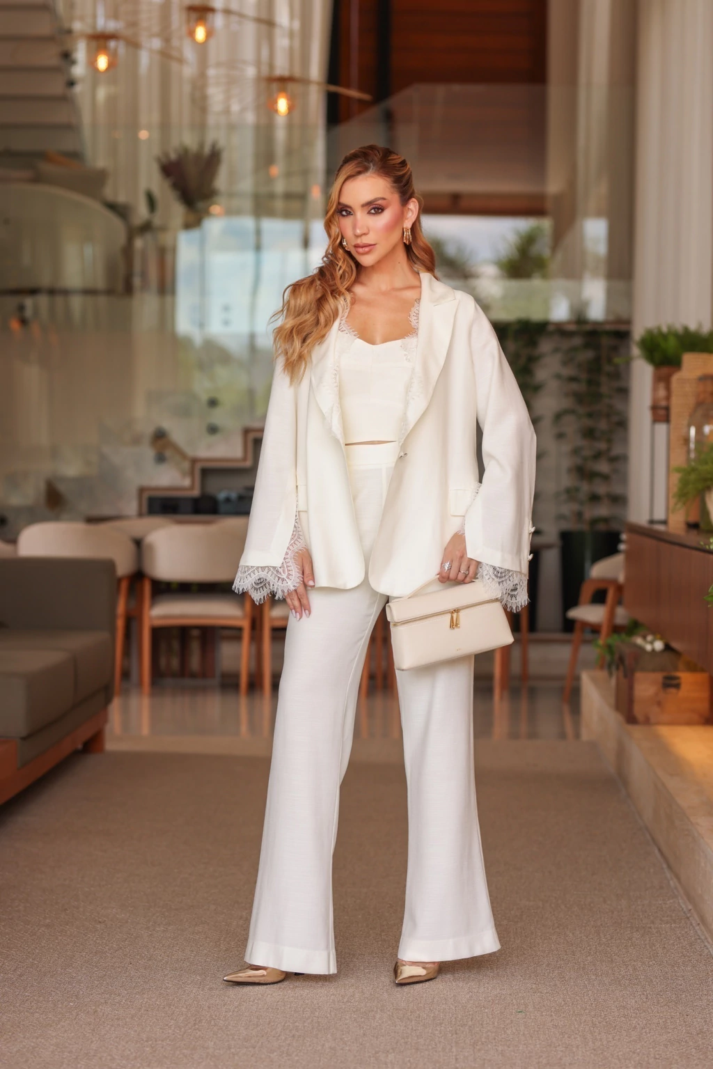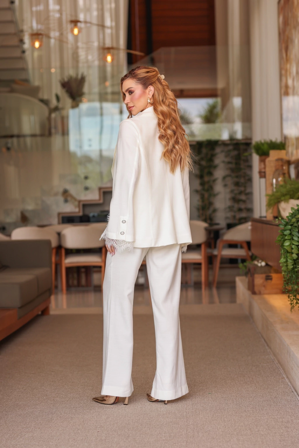 Confeccionado em alfaiataria, o conjunto equilibra modernidade e sofisticação. O mix de texturas entre a renda e a estrutura do blazer cria um visual elegante e atual, ideal para ocasiões em que o estilo precisa transmitir personalidade e refinamento. Versátil, o Eloá funciona tanto em produções clássicas quanto em propostas mais contemporâneas.