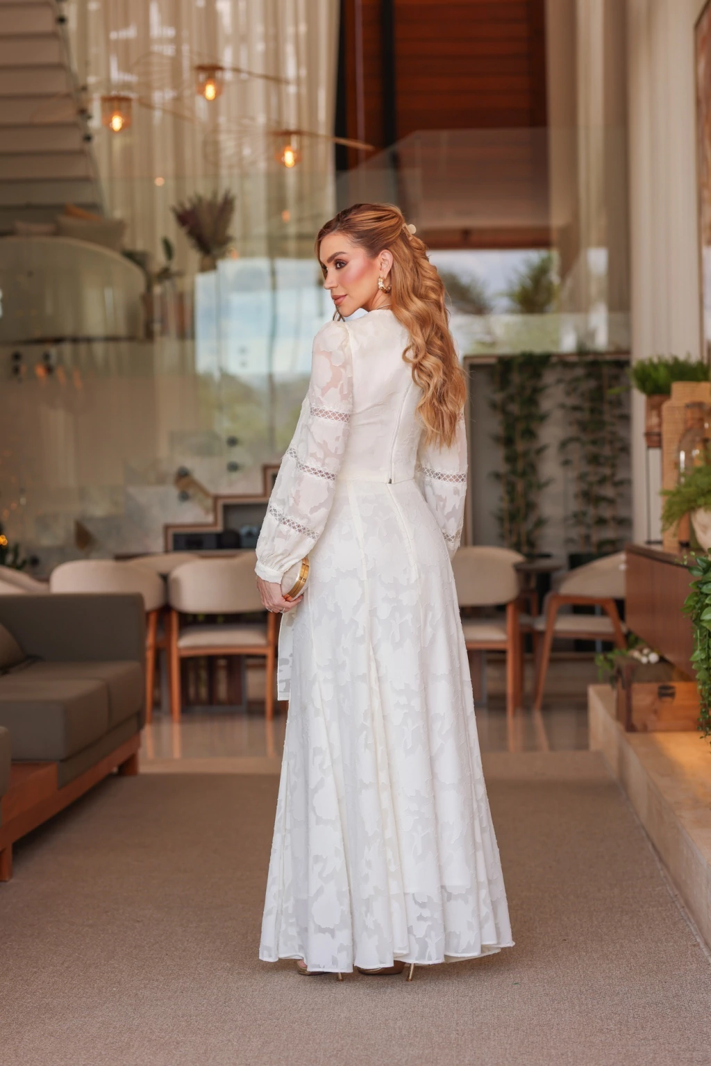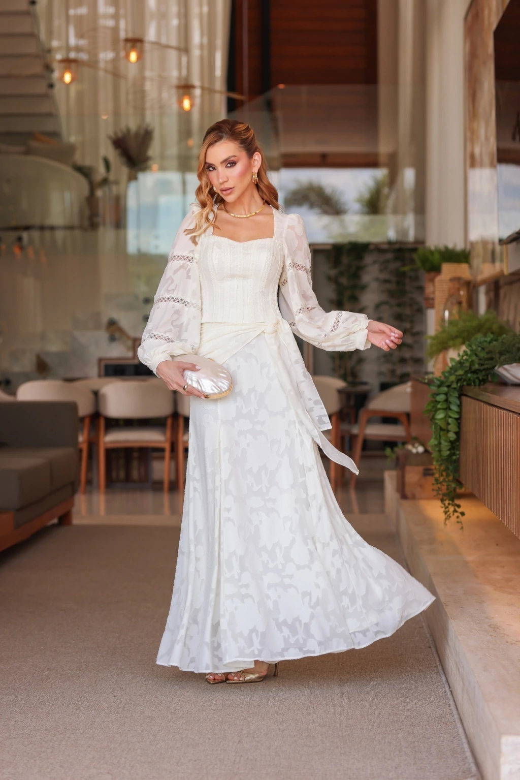 Combine com sandálias delicadas e acessórios dourados para um visual sofisticado e romântico, ideal para eventos diurnos ou celebrações ao ar livre.