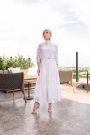 Confeccionado em renda e guipir, o Angelina apresenta mangas 3/4 com acabamentos elaborados, cintura marcada e saia midi com recortes que formam movimento fluido a cada passo. O cinto delicado complementa o visual, adicionando um toque contemporâneo sem perder a essência romântica da peça.