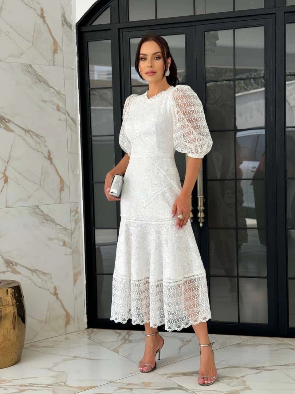 Confeccionado em renda delicada, modelo midi com mangas bufantes, recortes estratégicos que valorizam a silhueta e barra levemente evasê, garantindo movimento sofisticado.