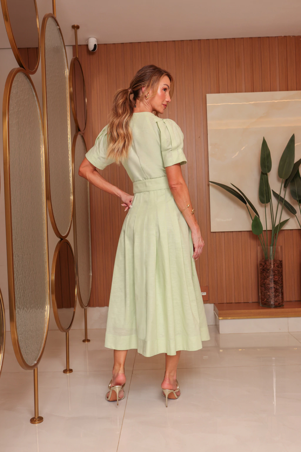 O Vestido Ruth é a combinação perfeita entre estrutura e leveza. Desenvolvido em tecido com excelente caimento, ele apresenta mangas com pregas, que criam volume sutil e um toque de romantismo, equilibrado pelo cinto com fivela dupla que realça a cintura de forma elegante.