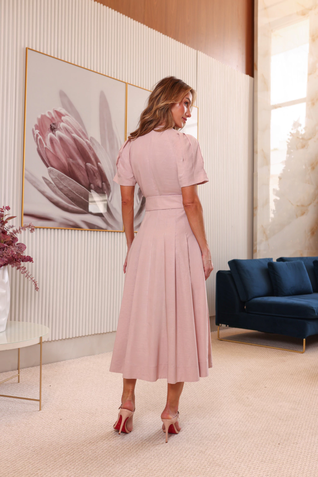 A saia com pregas invertidas confere movimento e fluidez, enquanto o fechamento frontal por botões forrados adiciona charme e praticidade ao modelo. Seu comprimento midi e o design atemporal tornam esta peça ideal para diversas ocasiões — de encontros diurnos a eventos especiais.